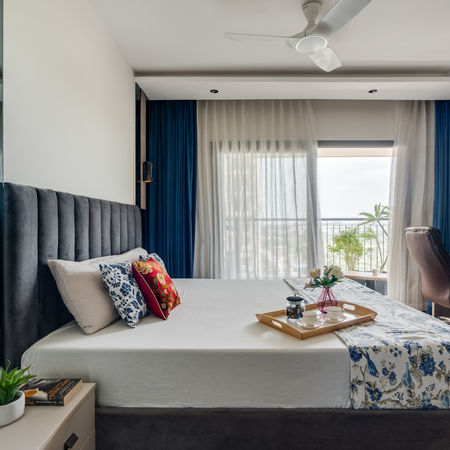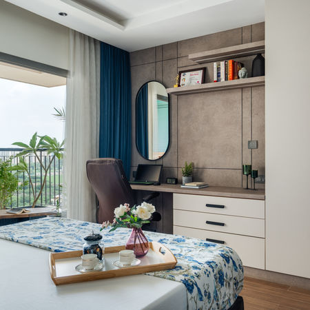 With deep blue curtains, textured walls, and a cozy workspace, the guest bedroom combines style with utility. The balcony adds natural freshness and light.
