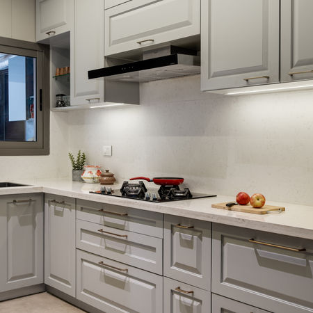 The kitchen is designed for efficiency and style with dual-toned cabinetry, quartz counters, and ambient lighting. Smart storage solutions ensure a clutter-free space while maintaining elegance.